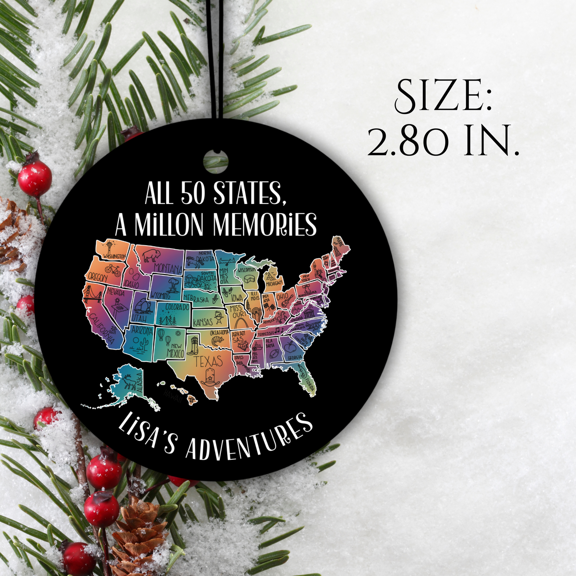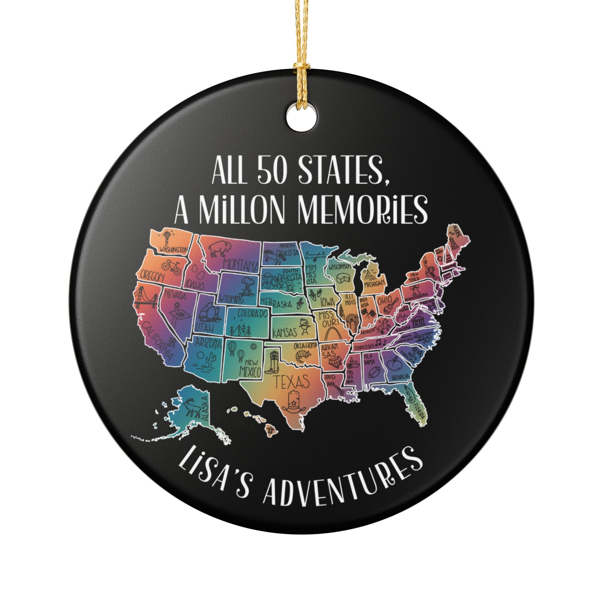 Celebrate your wanderlust and Christmas spirit with our personalized travel ornament. This is a perfect keepsake to cherish your completion of traveling to all 50 states.
