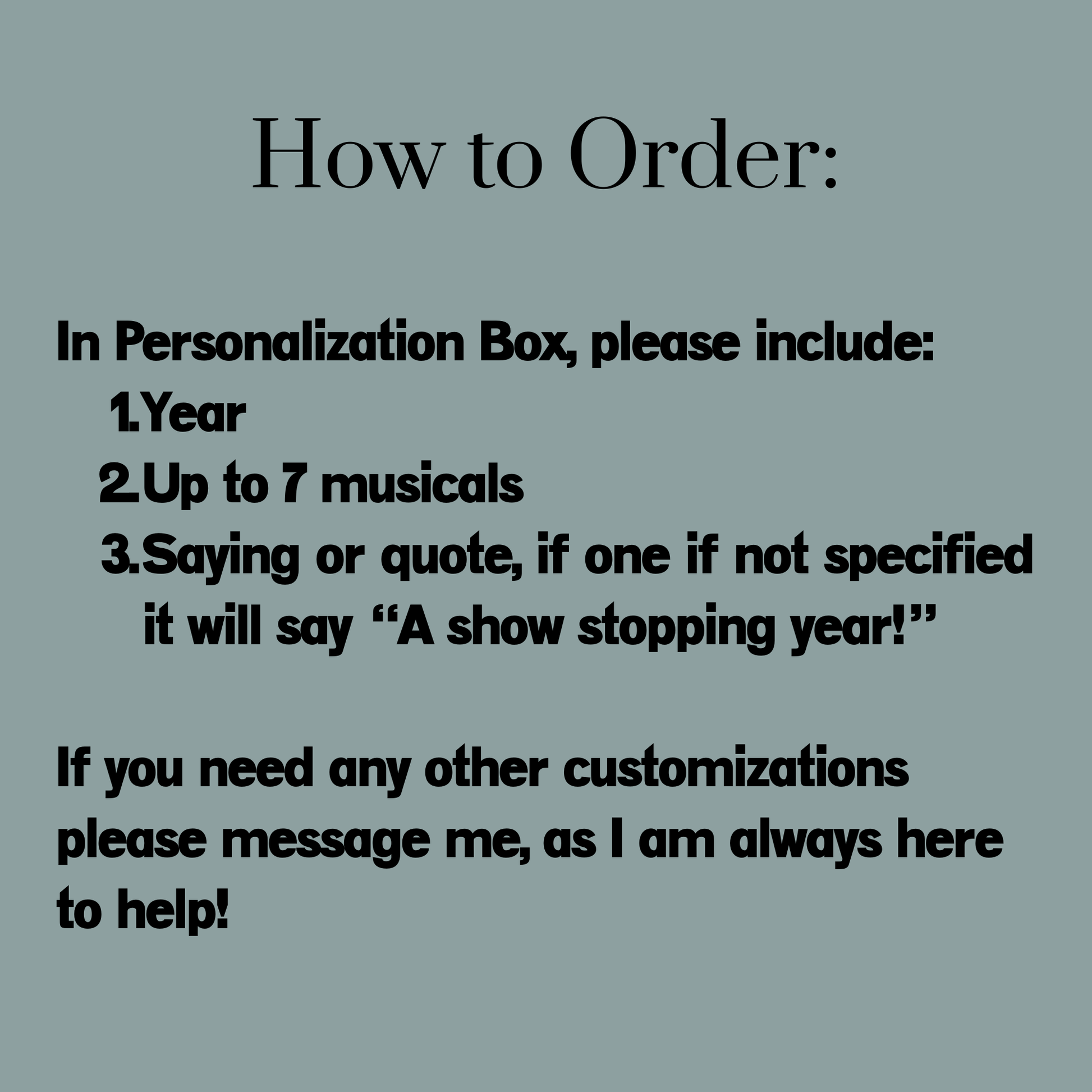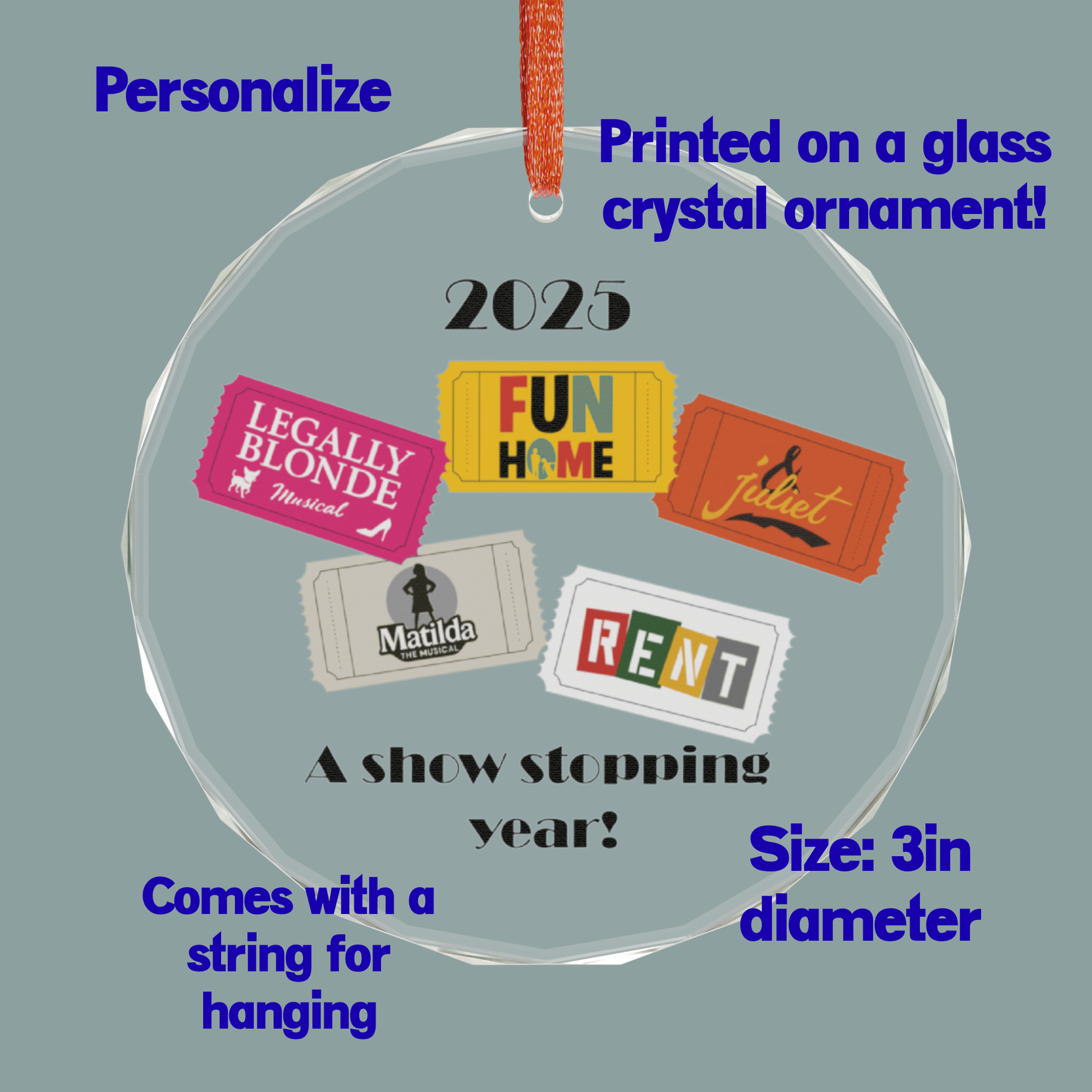 Celebrate your love of theatre with this stunning custom crystal ornament! Each ornament features up to 7 of your favorite musicals, represented by beautifully designed mini tickets.