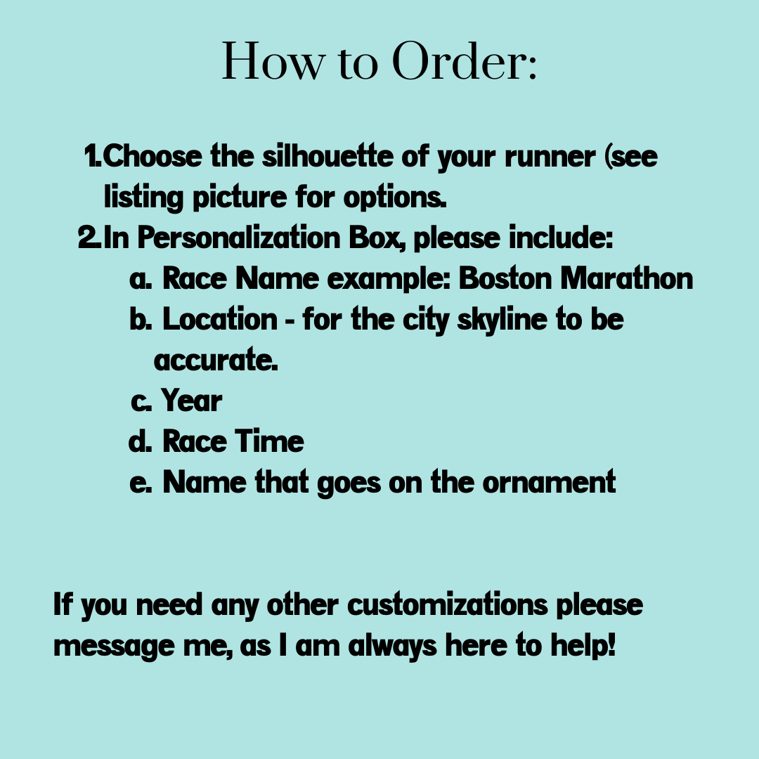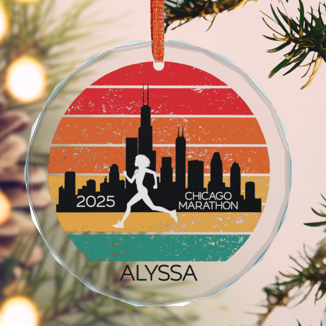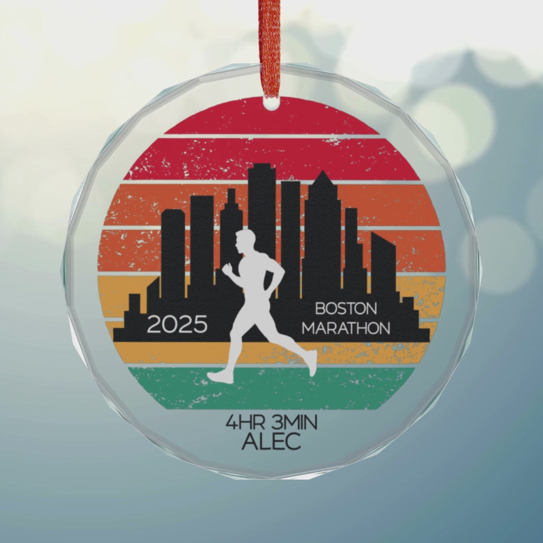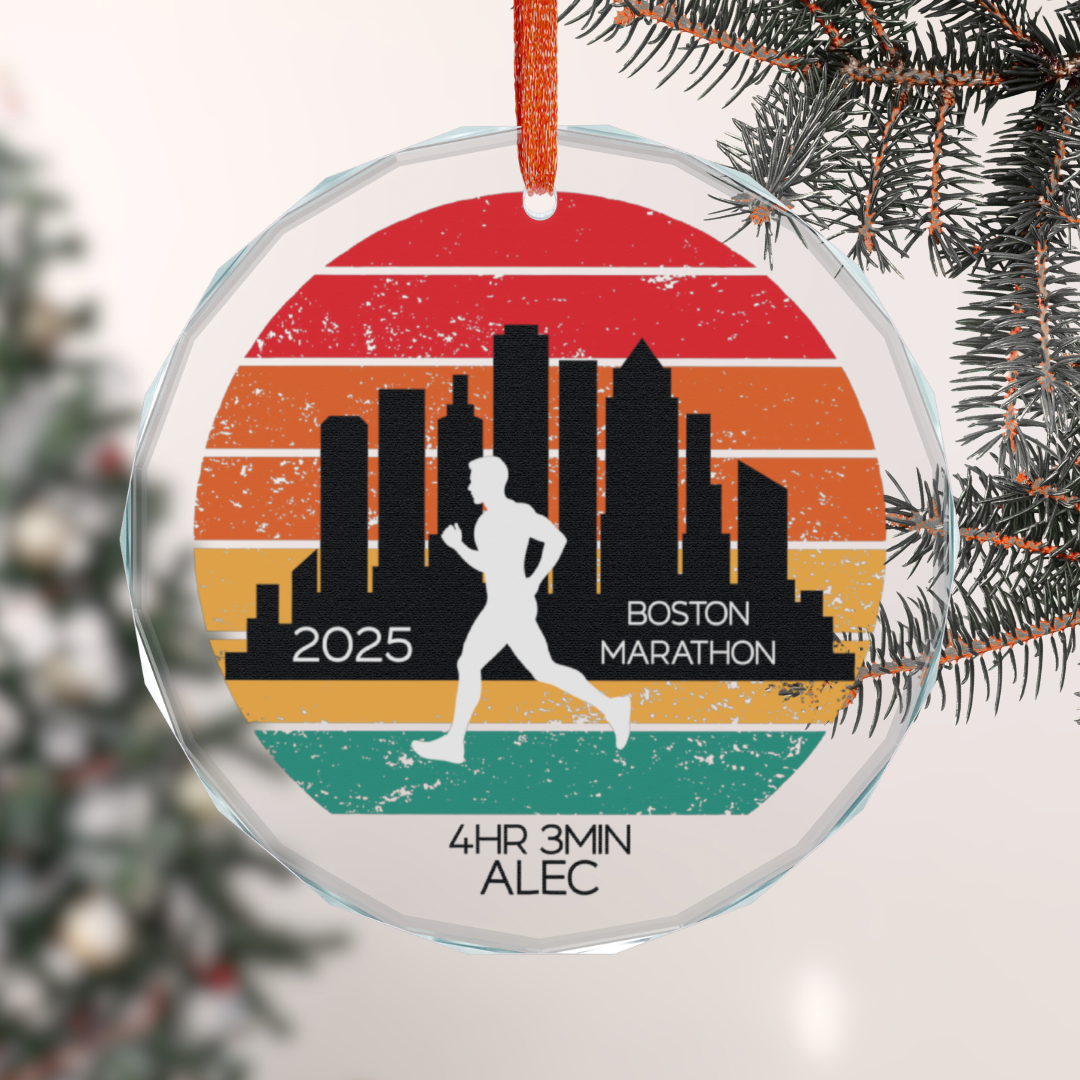 Honor that unforgettable finish line moment with this Personalized Marathon & Race Ornament. Featuring a retro city skyline and runner silhouette, this keepsake is customized with your city, race name, year, and finish time — making it the perfect way to remember your achievement.
